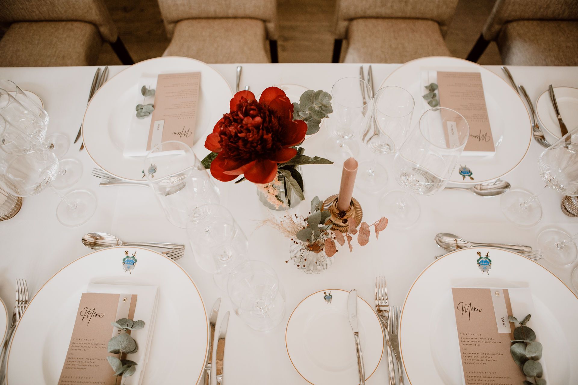 Conny: Ja, ich empfehle die Festtafel immer von beiden Seiten zu dekorieren. Man springt also immer ein wenig um den Tisch herum. Dadurch richtet man die Dekorationselemente ausgewogen aus. Steht man zum Beispiel immer auf der linken Seite des Tisches, dann passiert es ganz schnell, dass alle Elemente mehr nach links ausgerichtet sind. Das ist zum Beispiel bei Menü- und Getränkekarten ganz wichtig. Diese sollten immer so platziert sein, dass sie für alle Gäste gut lesbar sind. Und was ganz wichtig ist: man sollte die gesamte Länge des Tisches nutzen.